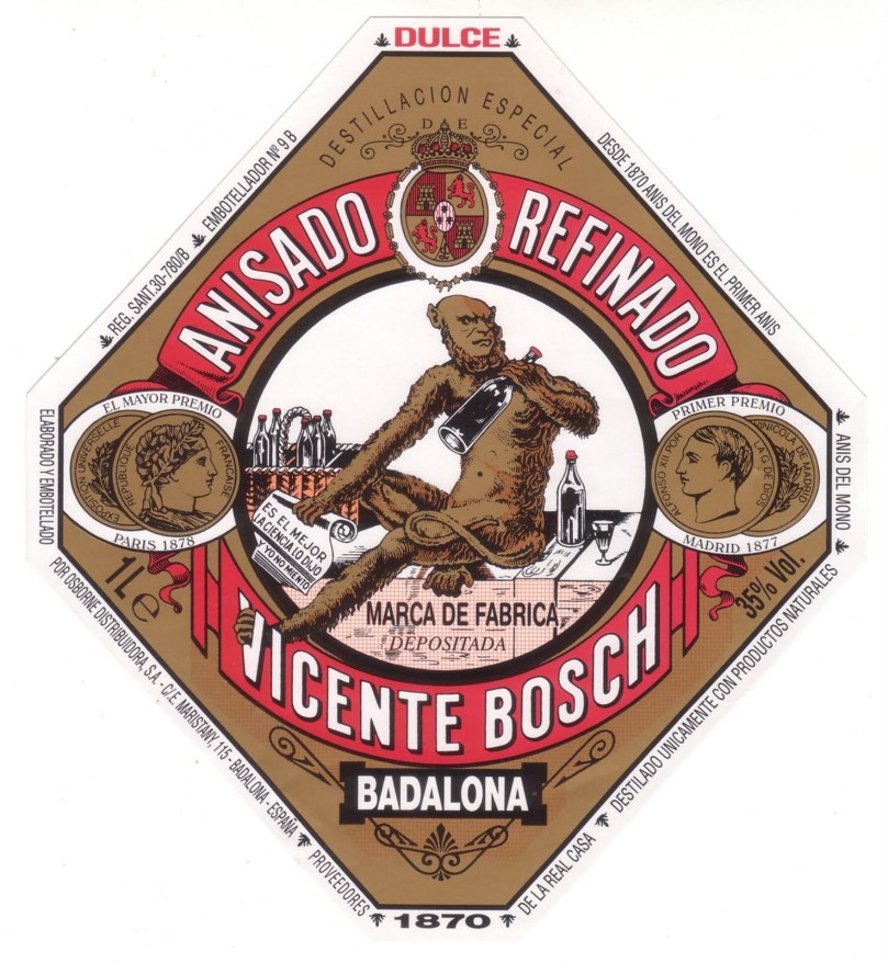 Anís del Mono se fundó en 1870 en la ciudad costera de Badalona, que se encuentra a poca distancia en tren de Barcelona. Hay muchas teorías sobre el nombre "Anís de mono", incluida la historia de que un mono mascota (enviado desde América, donde los hermanos fundadores tenían negocios) vivía en la fábrica; otra teoría sostiene que el nombre y la etiqueta (un mono con cara de hombre) es una oda a Darwin: el hombre de la etiqueta se parece al propio Darwin. La tercera teoría afirma que los hermanos eran en realidad anti-evolucionistas, y crearon al mono / hombre como una caricatura del científico. Claramente, como hemos visto, fue intencionadamente esta última.