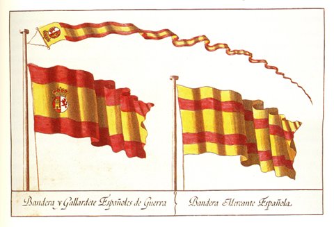 Felipe V sustituyó la cruz de Borgoña por el escudo de armas de su dinastía sobre un fondo blanco. Muchos reinos y naciones utilizaban el color blanco para sus banderas y esto suponía un problema de identificación, sobre todo en el mar, donde las banderas se veían desde lejos y era necesario saber a quién pertenecía la embarcación, pues podrían estar ante un aliado o ante un enemigo. Carlos III, hijo de Felipe V, encargó a Antonio Valdés y Fernández, ministro de Marina, que hiciera un nuevo diseño para la bandera y así terminar con estos problemas. De las doce propuestas, Carlos III escogió una bandera para los barcos militares y otra para los civiles. Así quedaron establecidas por Real Decreto de 28 de mayo de 1785. Este fue el nacimiento de la bandera rojigualda que, con sus cambios, ha llegado hasta la actualidad.