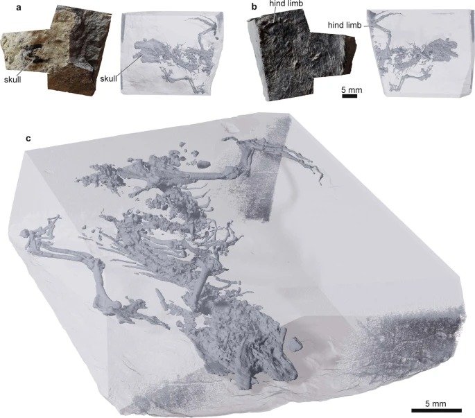 Efectivamente, el fósil ha podido ser analizado gracias a la tecnología. Un fósil de 6 centímetros que conserva todo el esqueleto está formado por minúsculos huesos que, de abrir la roca que rodea al espécimen destruiría parte del mismo y habría que reconstruirlo con la dificultad añadida de trabajar con piezas tan pequeñas en un puzzle muy complejo. La tomografía computarizada permite sacar imágenes 3D y estudiar el fósil sin tener que extraerlo de la roca.