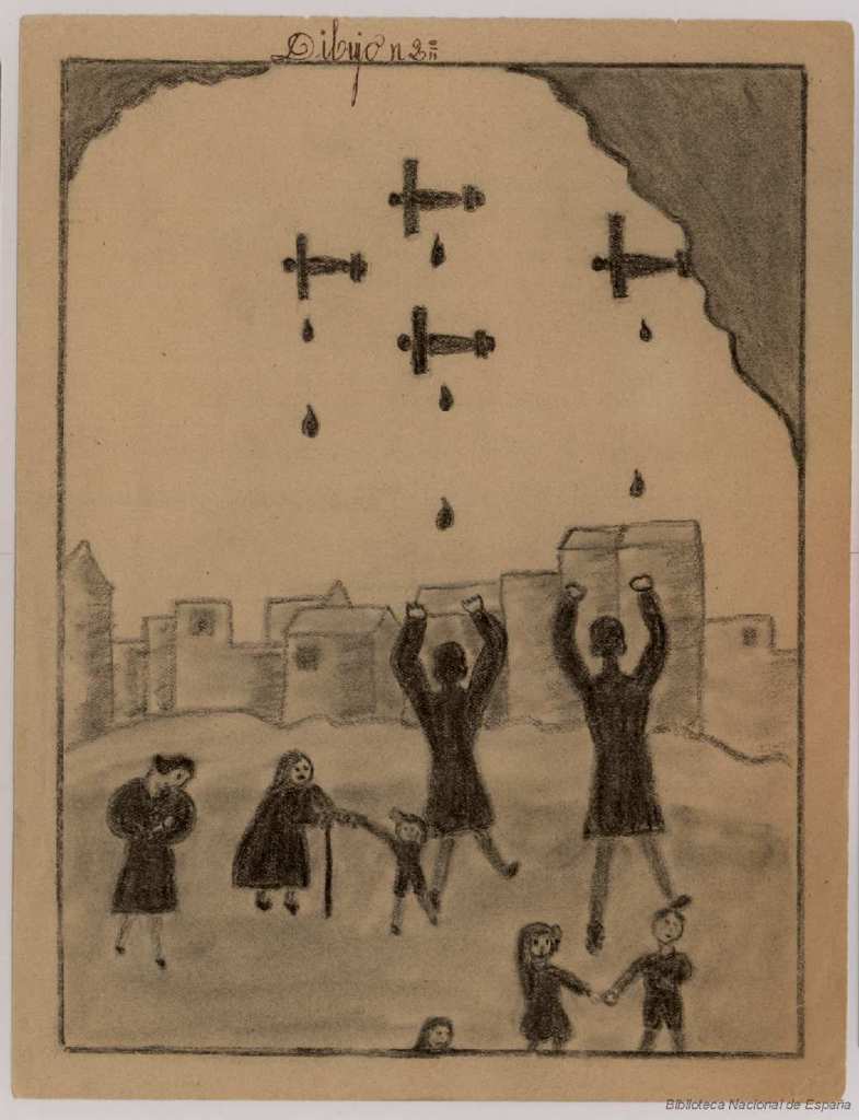 Quizás más duro puede ser el dibujo que se centra en los humanos y no en las máquinas, como el que hizo A. Boscá, de 10 años, con una valla como división de ambos bandos. Por último, cabe mencionar que ni siquiera en las colonias se libraban los niños de presenciar horrores. Así lo dejó dibujado y por escrito Mercedes Comellas, de 13 años: “esta escena representa un bombardeo cuando la gente desde un refugio está con los puños levantados diciéndoles maldiciones”. Mujeres, ancianas y niños presencian la masacre desde lejos.