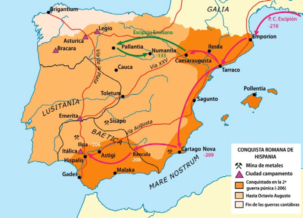 La invasión romana de Hispania es compleja e históricamente abarca varios siglos, desde 218 a.C. hasta el final de las guerras cántabras en 19 a.C. Los cartagineses, tras la Primera Guerra Púnica, decidieron que la península ibérica era un lugar estratégico, con tierras fértiles y abundantes minerales, por lo que durante varias décadas extendieron sus dominios hacia ella a través de alianzas y pactos con las élites locales o mediante la fuerza.