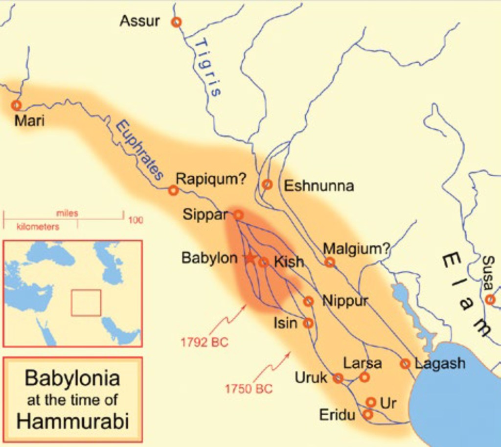 Hammurabi (ca. 1792-1750 a. C.) llegó al trono en un contexto de aumento de la tensión militar en la zona y gracias a numerosas campañas militares consiguió expandir las fronteras del reino hasta controlar toda la Baja Mesopotamia. Tales conquistas fueron acompañadas por obras de consolidación del reino, como son la construcción de templos, canales o fortificaciones, y por la intervención en la esfera económica con la imposición de varias reformas fiscales.