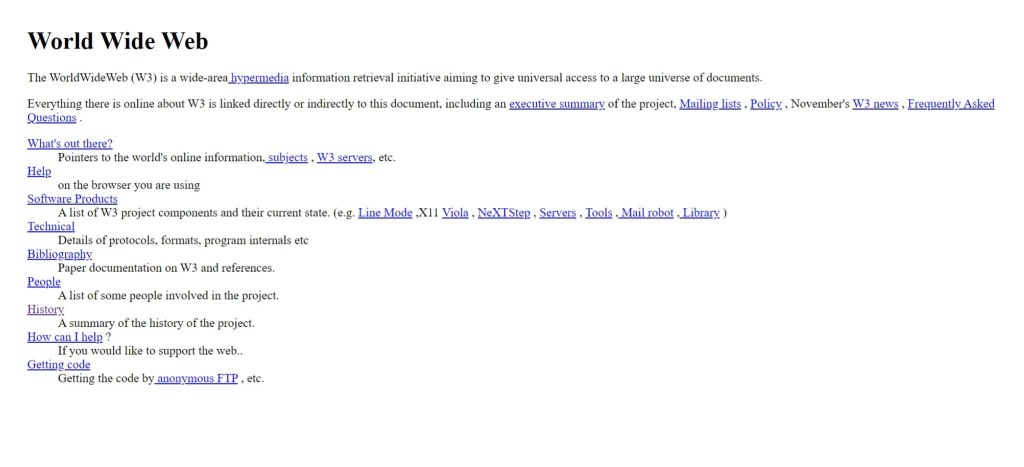 Como era de esperar, la primera página web tiene poco que ver con los sitios online por los que navegamos hoy día. Era algo muy sencillo, apenas un fondo blanco con texto, a la manera de un documento en papel, con su encabezado y apartados como si de un índice se tratara, con la excepcional novedad de que este documento tenía palabras en las que se podía clicar para acceder a otra documentación.