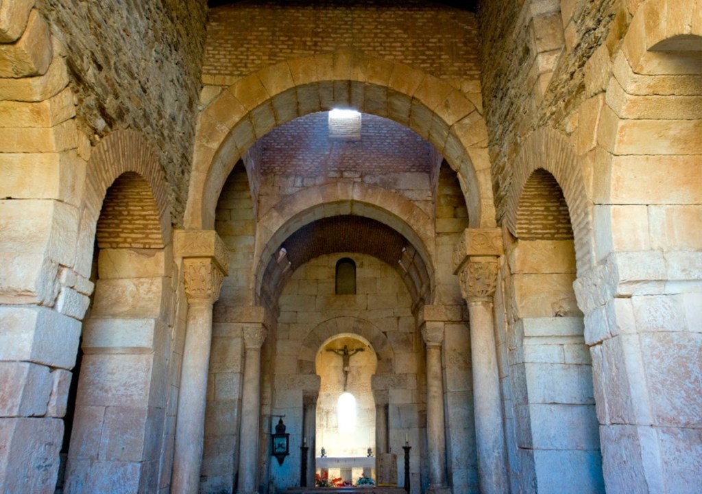Tiene tres naves rematadas en una cabecera cuadrangular, con un transepto en la zona central del edificio. El espacio interior muestra una clara tendencia hacia la verticalidad y, a excepción del eje formado por la nave central, a la compartimentación espacial. Las cubiertas eran en origen de tramos de bóveda de cañón, conservándose la de la cabecera y algunos tramos del sector oriental del edificio. Es también importante su decoración escultórica, en especial capiteles, cimacios, impostas y frisos.