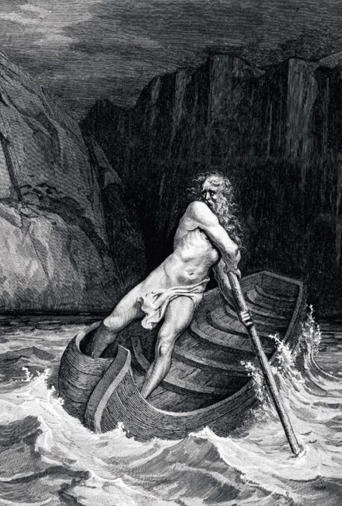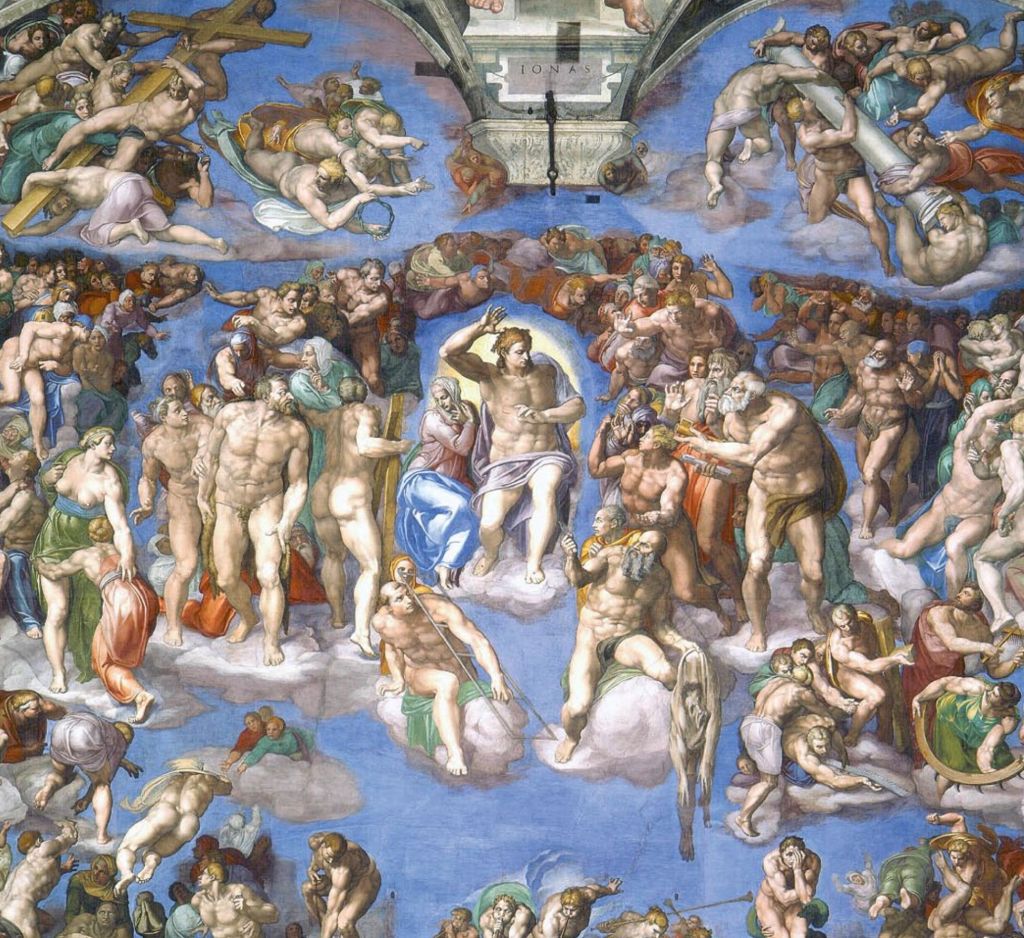 La crisis en que se veía sumida Roma tras el saqueo de 1527, las continuas hambrunas y la escisión protestante servían de escenario desolador para representar el fin del mundo, el momento en el que Cristo juez separaría a los justos de los pecadores. Y justo en la esquina inferior derecha desde el punto de vista del espectador, debajo de cuerpos arremolinados de condenados que caen directos hacia el infierno, nos encontramos con Caronte, como un demonio amenazante que con una pala empuja a los pecadores fuera de su barca. Cerrando la composición, con cuerpo hercúleo, rodeado de serpientes y con orejas de asno, Minos, como príncipe del Hades. Ambas horrendas figuras están inspiradas, sin lugar a dudas, en la Divina Comedia (ca. 1303-ca.1321) de Dante Alighieri, más concretamente en su primer libro: El Infierno.