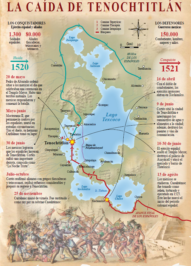 La toma de Tenochtitlán es, sin duda, una de las batallas más importantes de la historia universal. Españoles, tlaxcaltecas y mexicas lucharon con bravura durante ochenta días, pero fue el genio político, militar y estratégico de Cortés el que condujo a españoles y tlaxcaltecas hasta la victoria sobre el poderosísimo Imperio azteca.