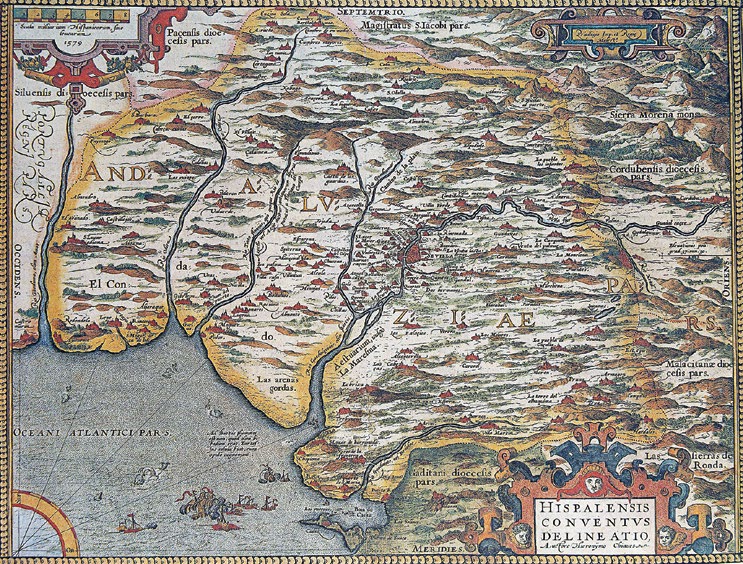 Mapa de España del año 1579, de Hieronymus Chiave. Detalle de las provincias de Huelva, Cádiz y Sevilla. Biblioteca Nacional de España. Foto: Album.