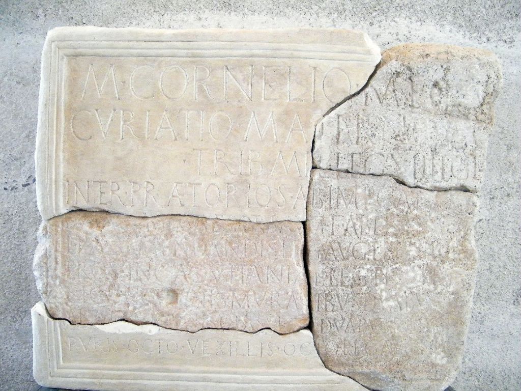 “Marco Cornelio, hijo de Marco de la tribu Galeria, Nigrino Curiatio Materno, cónsul, tribuno militar de la legión XIII gemina, pretor con los emperadores Vespasiano y Tito, legado augusto de la legión VIII Augusta, propretor de la Provincia Aquitania, legado propretor de la provincia de Moesia, recibió por la guerra en la Dacia dos coronas murales y dos coronas vallares y dos coronas clásicas y dos coronas áureas y hasta ocho hasta purae y ocho vexiliae, legado augusto propretor de la provincia de Siria”.