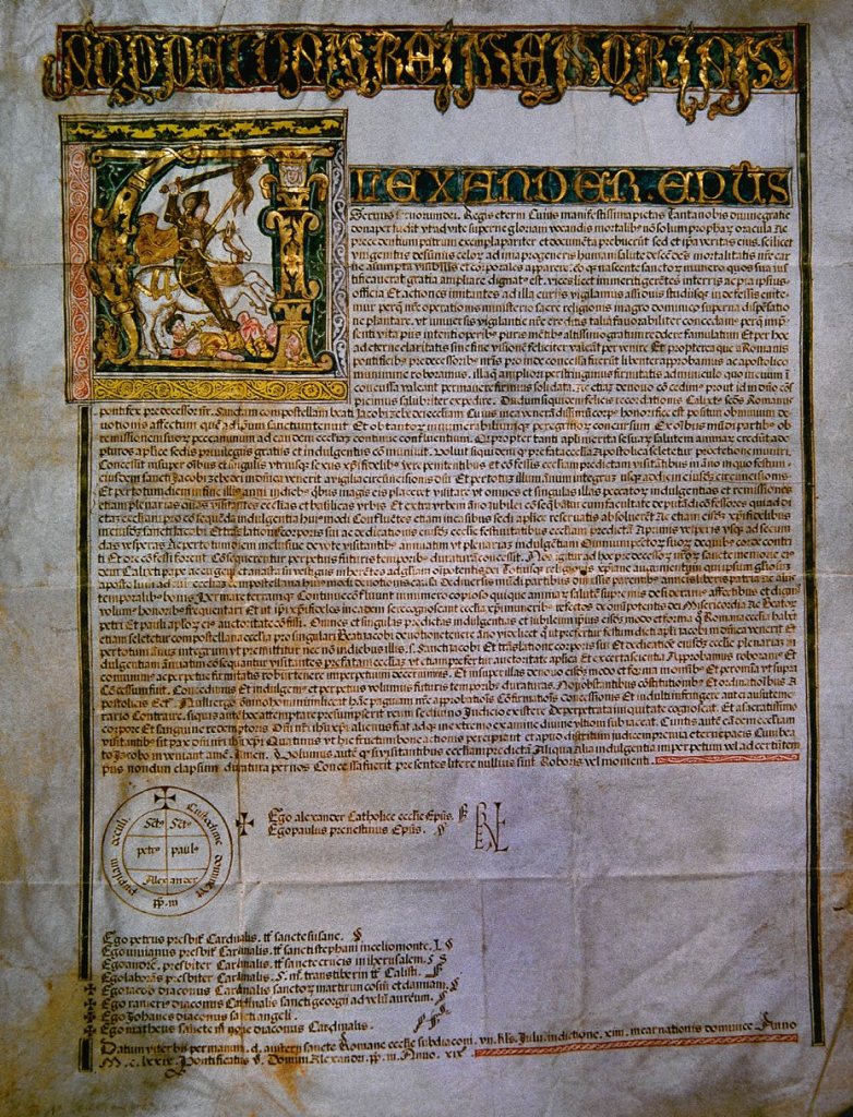 Pero los siglos del gótico depararían aún grandes producciones artísticas para la catedral gallega, pues el mismo obispo don Juan firmó un documento donde se narra uno de los conflictos internos más interesantes de la institución catedralicia. El diploma revela el litigio por controlar las cuantiosas donaciones de los fieles y peregrinos. Así, sabemos que, por una parte, existía el arca del altar de la catedral y, por el otro, ubicada en el ángulo del transepto norte, el arca de la obra, que competía y rivalizaba por acaparar las donaciones. Fue precisamente en este último cepillo donde se colocó una imagen de Santiago Alfeo que aún hoy perdura.