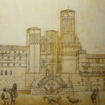 Las fuentes nos informan sobre la historia de ese espacio perdido. La Historia Compostelana —texto compuesto entre los años 1107 y 1149— refiere que habían transcurrido cuarenta y seis años desde el comienzo de la catedral románica y, sin embargo, aún no se había concluido la construcción del claustro. Gracias al patronazgo del obispo Diego Gelmírez se inició este proyecto que, entre los años 1122 y 1137, aún debía estar en marcha. Sin embargo, la planificación y remate de obras de esta envergadura durante la Edad Media, como es sabido, fue compleja, con parones derivados de las vicisitudes económicas, los problemas bélicos o las inestabilidades políticas.