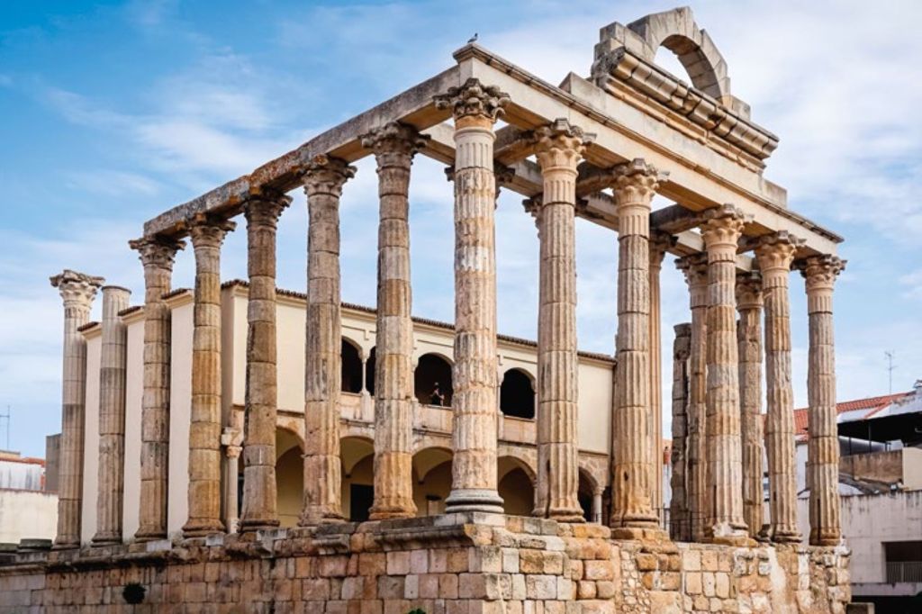 En el centro de este espacio se encontraba un colosal templo, también recubierto de mármol, que posiblemente estaba consagrado al Divo Augusto. Este templo hexástilo poseía una planta peculiar, llamada a cella barlonga (en el que la cella está dispuesta de forma transversal en relación con la pronaos), que tiene su modelo exacto en el templo de la Concordia de Roma. Gracias a una inscripción hallada en las excavaciones de Mérida, sabemos que este templo fue construido entre los años 26 y 30 d. C. por el prefecto fabrum Cornelio Bocho, por encargo del gobernador provincial de la Lusitania, Fulcinio Trio.