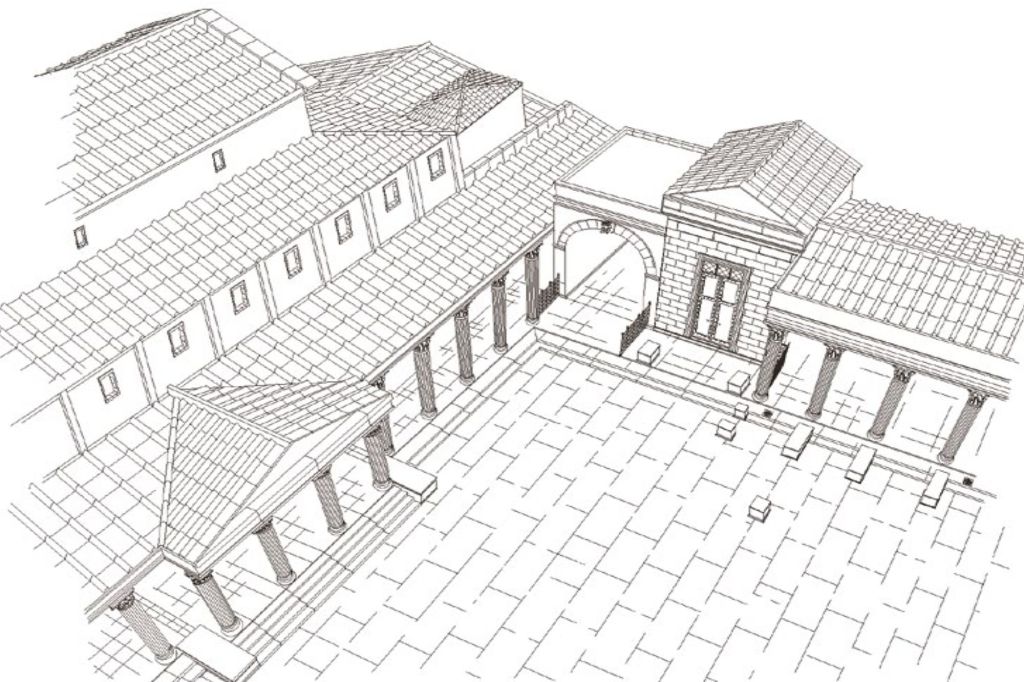 Por el contrario, a partir de la segunda mitad del siglo I d.C. se construyeron los pórticos y edificios que enmarcaban la plaza por tres de sus lados como un conjunto unitario tanto arquitectónicamente como cronológicamente.