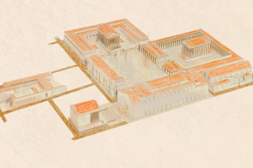 Además de los recintos forenses situados en la zona central de la ciudad, en época del emperador Tiberio se construye un nuevo recinto sacro monumental al norte del foro de la colonia.