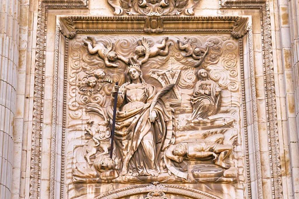 La fachada, además, se configuró como un retablo pétreo para acoger las devociones de la Iglesia universal y local, con un programa iconográfico diseñado, en buena parte, por los canónigos Diego de la Justicia, Bernardo de Aguirre y el superintendente de la obra, Fernando Zorrilla.