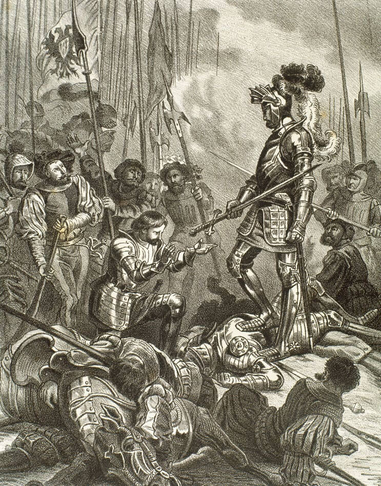 Al mediodía del 24 de febrero de 1525 todo estaba perdido para los galos. Francisco I, rey de Francia, había sido apresado tras la batalla de Pavía por las tropas de Carlos I y departía, nervioso, con los soldados que le rodeaban. Uno de ellos, un tal Roldán, se le acercó. Traía en las manos tres balas de arcabuz: dos de plata y una de oro. «Sepa que ayer hice seis pelotas para vuestros caballeros y una para vos. Muchas de plomo he disparado a gente común, y las otras cuatro fueron bien empleadas. La de oro veísla aquí, muestra de que deseaba daros la muerte más honrosa que a príncipe se ha dado, pero no quiso Dios que os viera», le espetó. Después, alargó la mano y se la entregó. «Que sirva para vuestro rescate». Humillado, el monarca aceptó. Aquel gesto puso fin a los gendarmes, la mejor caballería pesada de Europa.