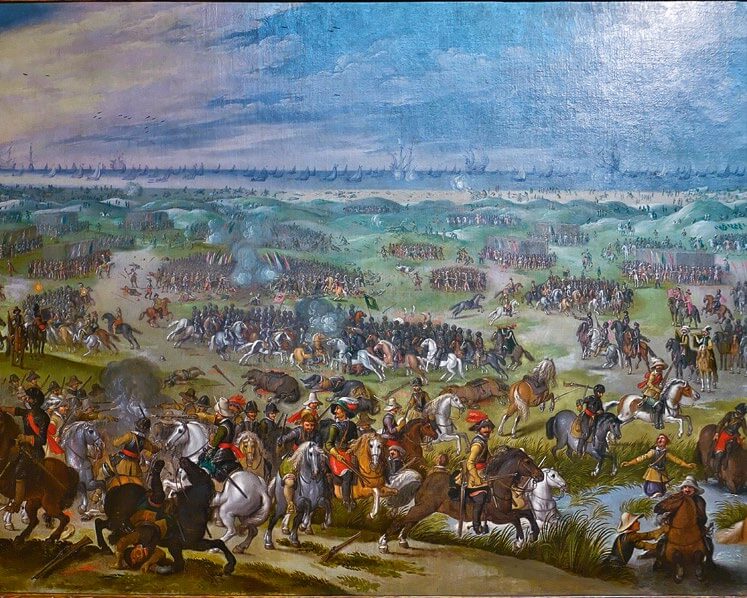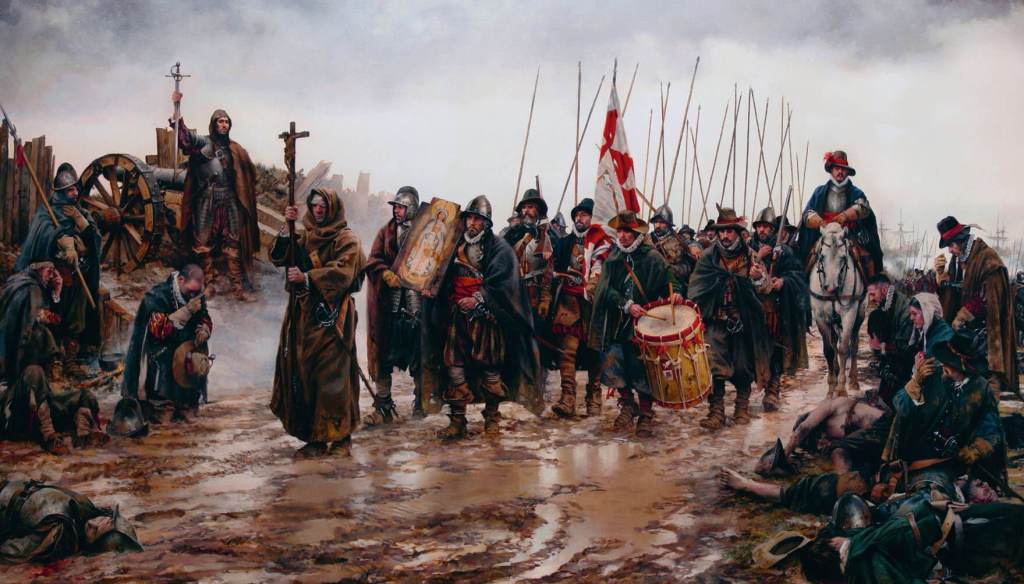 Es curioso, pero, es en grabados y cuadros de fuera de España donde más se ha pintado a los tercios a lo largo de la historia. Cuando te documentas con los clásicos, y con la salvedad de Velázquez y algunos ejemplos locales, te tienes que ir a maestros como el flamenco Sebastian Vrancx. Este pintor nacido en Amberes alumbró cuadros como la Batalla de Nieuwpoort (la primera batalla de las Dunas, con victoria de las Provincias Unidas) o El sitio de Ostende, en el que sí ganó la Monarquía Hispánica después de un asedio que se extendió durante tres años.