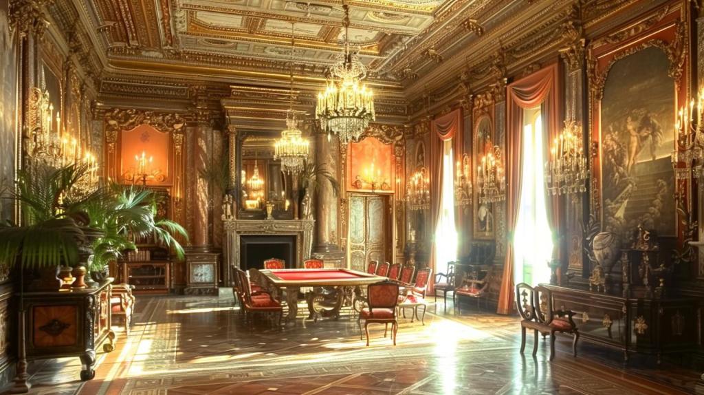 Si bien la fachada del Palacio Fernán Núñez puede ser más sobria en comparación con la antigua residencia real construida por el rey Luis XIV de Versalles, los interiores cuentan una historia diferente. Podemos encontrar intrincados estucos, lujosos tapices y amplios frescos que celebran temas relacionados con la naturaleza y la mitología, muy parecidos a los que podemos encontrar en los grandes salones franceses. También hay una gran variedad de espejos ornamentales, candelabros de cristal y detalles en madera dorada que realzan esta influencia barroca, creando un ambiente continuo de grandeza.