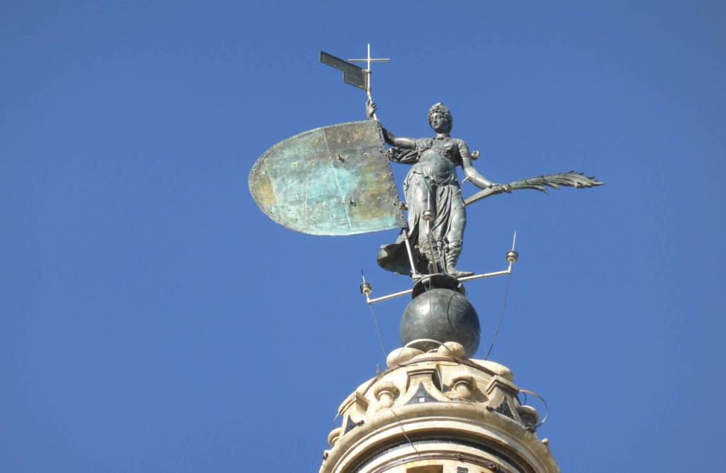 La palma que lleva la figura es un antiguo símbolo de martirio y triunfo, comúnmente asociado con el triunfo de los mártires cristianos y la victoria de la fe. La indumentaria, que incluye un casco adornado con flores de lis, refuerza esta narrativa de nobleza y protección divina. El conjunto de estos elementos no solo refleja la maestría artística del Renacimiento, sino que también comunica un mensaje poderoso de resistencia espiritual y victoria. Así, el Giraldillo es más que una obra de arte decorativa, es un emblema cargado de significado religioso y cultural, que representa la fortaleza y la fe victoriosa en un periodo de profundos cambios sociales y religiosos en España.