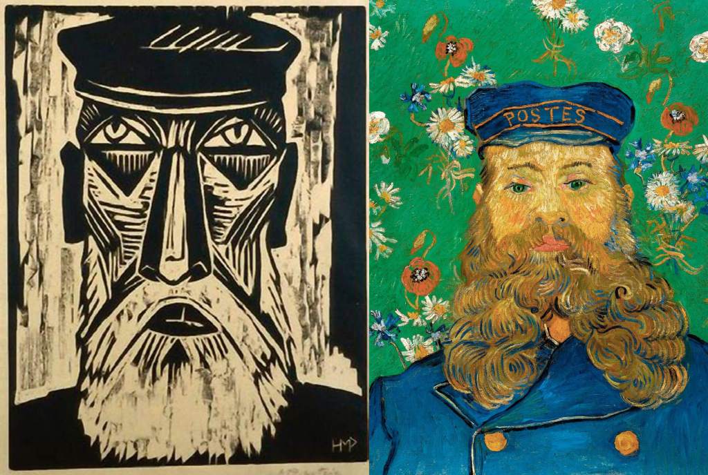 Pero estas no son las únicas obras de Pechstein y Van Gogh con similitudes. En 1921, el artista alemán realizó una xilografía, Retrato de un pescador (1921), que al menos formalmente, remite al retrato a plumilla que el pintor neerlandés hizo al cartero Joseph Roulin (1888). En ambas obras, dos hombres barbados de cierto parecido físico portan una gorra con visera y se sitúan sobre un fondo neutro mirando directamente al espectador.