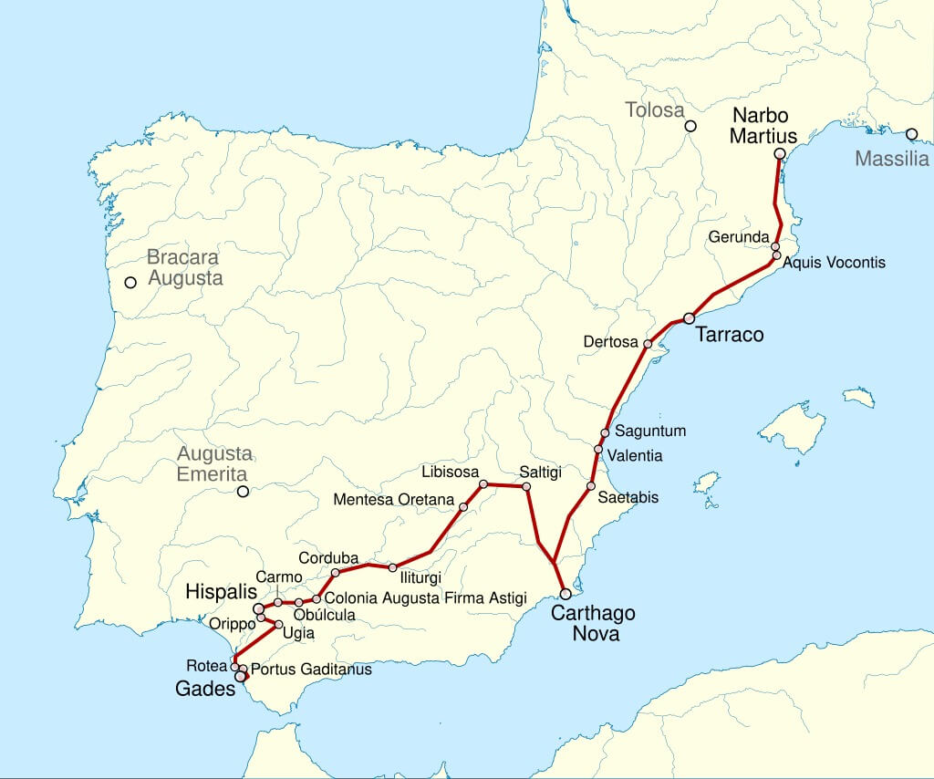 La Vía Augusta, diseñada magistralmente para ser lo más recta posible, recorría aproximadamente 1500 kilómetros a lo largo de la costa mediterránea de la península ibérica. Su trazado comenzaba en Cádiz y se extendía hasta los Pirineos, enlazando con la Vía Domitia hacia Roma. A lo largo de su ruta, esta calzada monumental atravesaba importantes centros urbanos como Sevilla, Córdoba, Valencia y Tarragona, antes de llegar a la frontera con Francia.