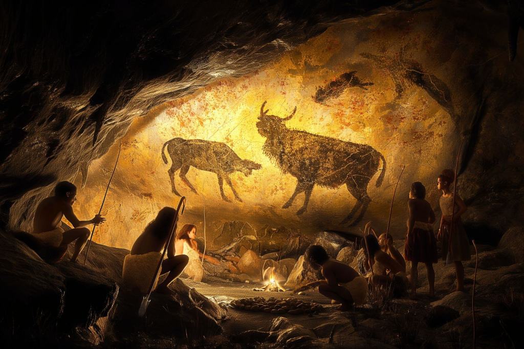 Hace unos 35 000 años, Homo sapiens pasó a otro nivel intelectual al dar vida al lenguaje simbólico y al arte. Las cavernas oscuras se convirtieron en lienzos donde se plasmaban grandes herbívoros y escenas de caza, no solo como decoración, sino como una meditación profunda sobre la vida y la comunidad. Estas pinturas rupestres, halladas en rincones recónditos de cuevas, eran manifestaciones de un pensamiento complejo y una comunicación sofisticada. El arte prehistórico reflejaba el mundo natural, pero también funcionaba como un vehículo para transmitir conocimiento, unir al grupo, y explorar significados más allá de lo visible, cimentando las bases de la civilización humana.