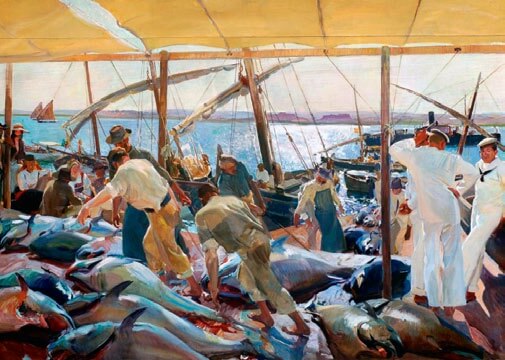 Con el movimiento se refiere a la capacidad del pintor para captar la esencia de una acción en una sola imagen. Cada figura —cada gesto de cada uno de sus personajes— posee una extraordinaria expresividad y refleja de manera perfecta la acción que realiza, desde los niños que juegan en la orilla en Corriendo en el mar (1908) a los hombres que arrastran a tierra sus capturas en La pesca del atún (1919). Por último, Alcaine destaca el uso de la luz y el color como elemento esencial del trabajo del artista, del que reconoce haber aprendido valiosas lecciones que luego ha aplicado como director de fotografía.