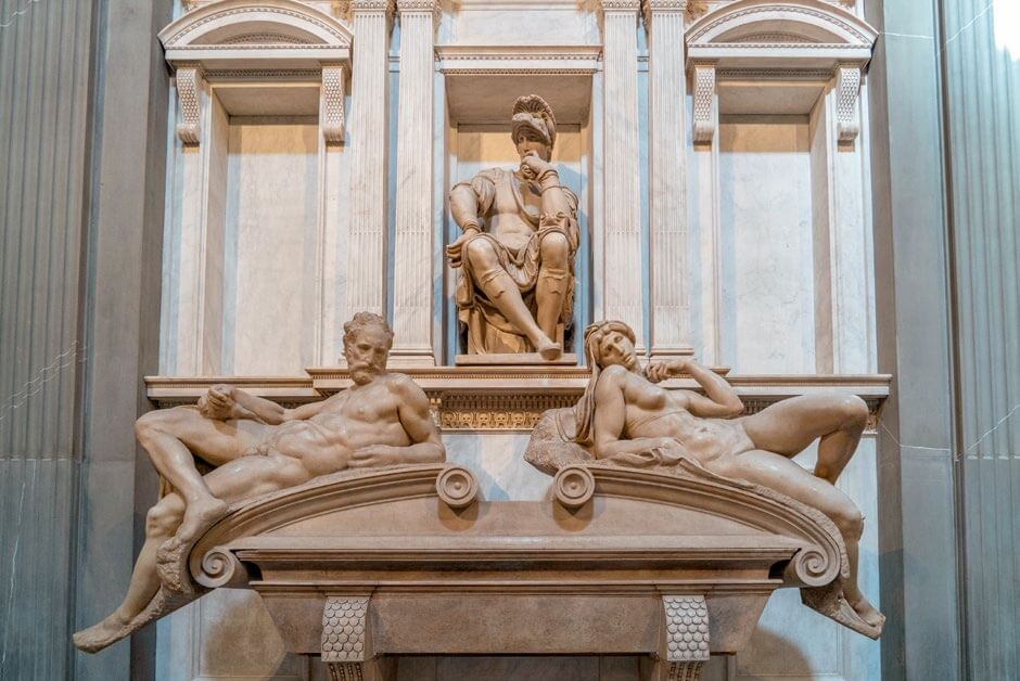 El poder no está presente en estas representaciones de los poderosos, tal vez porque Miguel Ángel no sintió la terribilidad de los retratados como sí sintió la de Julio II. Fue otro su interés, centrado en las soluciones arquitectónicas, pese a las potentes representaciones de la Noche y el Día para la tumba de Juliano y de la Aurora y el Crepúsculo para la de Lorenzo. El complemento de la Virgen con el Niño en el muro al que miran ambos magníficos contribuye a disolver la rotundidad de un conjunto de una belleza poco común.