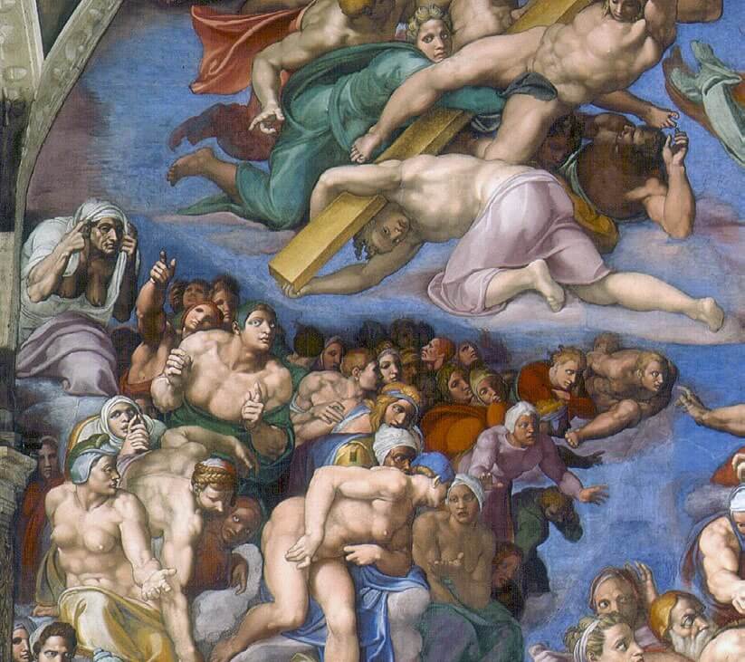 Miguel Ángel, inspirándose en los textos apocalípticos de la Biblia y en la Divina Comedia de Dante Alighieri representó las escenas del Juicio Final en su fresco. Cristo —situado en el centro de la composición— decide implacable el destino de los hombres más allá del mundo terrenal: los «escogidos o bienaventurados » a ascender al paraíso (a la izquierda de la composición) y los «condenados» a descender a las profundidades del infierno (a la derecha de la obra). Estas figuras —las de los salvados y los hundidos— nos remiten al proceso de «selección» que se llevaba a cabo en la rampa del campo de Auschwitz, donde los que se salvaban y los que se dirigían a la cámara de gas —el infierno— eran elegidos al azar, según los criterios que escogían los propios verdugos. Después de la selección efectuada por los SS, en los campos —tal como explica Primo Levi, el escritor italiano de origen judío y superviviente de Auschwitz, en Si esto es un hombre— se producía una especie de «selección natural», la de los fuertes y la de los débiles, los salvados y los hundidos.