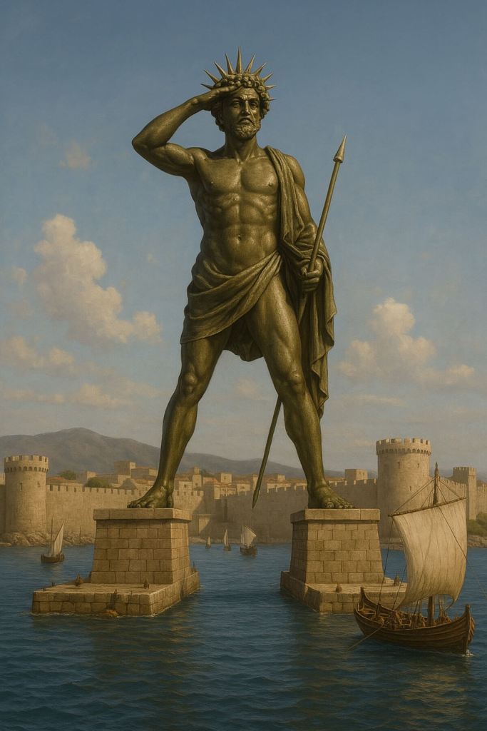 El Coloso de Rodas fue una estatua gigantesca del dios Helios, construida en la isla griega de Rodas hacia el año 280 a.C. para conmemorar la victoria de la ciudad sobre el asedio del rey Demetrio Poliorcetes. La escultura, obra del artista Cares de Lindos, alcanzaba unos 33 metros de altura, lo que la convertía en una de las más altas del mundo antiguo. Hecha de bronce forjado y apoyada en un armazón de hierro y piedra, la imagen que recreamos representa una de las versiones más extendidas —aunque posiblemente mítica—: la del dios en posición erguida, con las piernas abiertas sobre la entrada del puerto, mientras las naves pasaban bajo él.