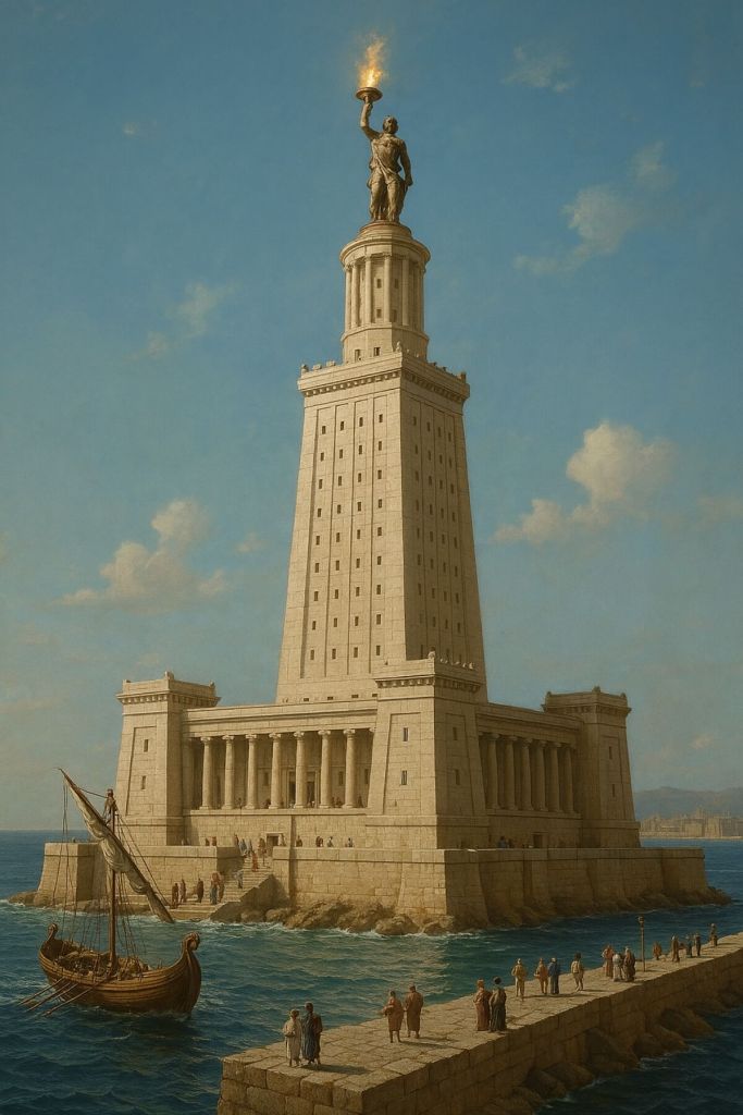El Faro de Alejandría, también conocido como el Faro de Faros, fue una proeza de la ingeniería helenística y un símbolo del poder y el conocimiento del Egipto ptolemaico. Construido entre los años 280 y 247 a.C. en la isla de Faros, frente al puerto de Alejandría, se estima que alcanzaba entre 100 y 130 metros de altura, lo que lo convirtió durante siglos en una de las estructuras más altas jamás construidas por el ser humano. Su estructura estaba dividida en tres secciones: una base cuadrada, un cuerpo octogonal y un remate cilíndrico coronado por una estatua, posiblemente de Zeus o Poseidón. La imagen recrea este diseño escalonado, basado en las descripciones de autores como Estrabón, Plinio el Viejo y Al-Masudi.