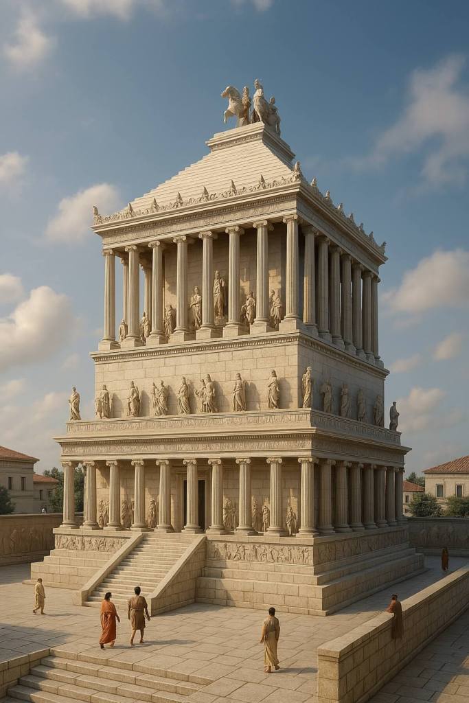 El Mausoleo de Halicarnaso fue concebido no solo como tumba, sino como una afirmación de poder y belleza eterna. Mandado construir por Artemisia II en honor a su esposo Mausolo, sátrapa de Caria, el edificio fue terminado hacia el 350 a.C. en la ciudad de Halicarnaso, actual Bodrum (Turquía). Su monumentalidad inspiró el término “mausoleo” para referirse a tumbas de grandes dimensiones. Medía unos 45 metros de altura y combinaba elementos arquitectónicos griegos, egipcios y licios. La imagen recrea su estructura escalonada: una base rectangular decorada con relieves, una columnata jónica, una pirámide escalonada y, coronándolo todo, una cuádriga de mármol con las estatuas de Mausolo y Artemisia.
