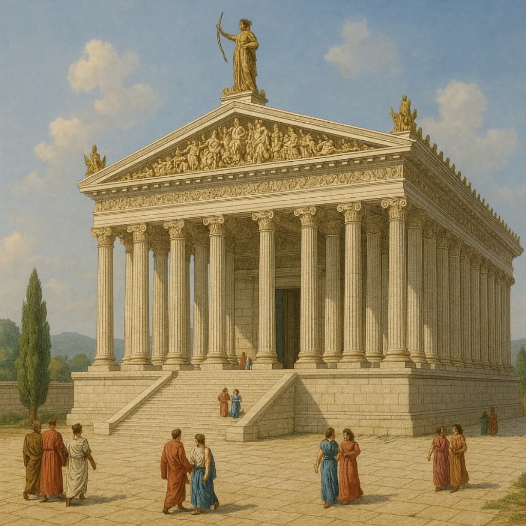 Este templo fue destruido y reconstruido varias veces. La versión más conocida, la que lo elevó al estatus de maravilla, fue completada hacia el año 550 a.C. por encargo del rey Creso de Lidia. Combinaba funciones religiosas y comerciales: no solo era lugar de culto, sino también refugio para perseguidos, centro económico y símbolo de la identidad local. El interior albergaba una estatua colosal de Artemisa, posiblemente decorada con metales preciosos y piedras, muy distinta a la imagen habitual de la diosa, pues aquí era representada con múltiples pechos, símbolo de fertilidad.