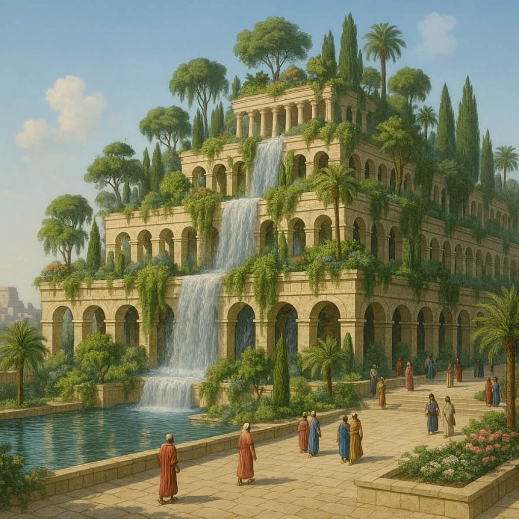 Los ingenieros mesopotámicos pudieron haber empleado un mecanismo basado en norias o tornillos de Arquímedespara elevar el agua desde el Éufrates hasta las terrazas superiores. Este sistema hidráulico, junto con el uso de ladrillos impermeables y bóvedas de ladrillo cocido, habría sido clave para sostener un jardín de tales dimensiones en pleno desierto. La imagen busca plasmar esa proeza técnica y estética, imaginando las cascadas artificiales, las sombras de la vegetación sobre los arcos de piedra y el frescor imposible que el oasis suspendido ofrecía a los habitantes de Babilonia.