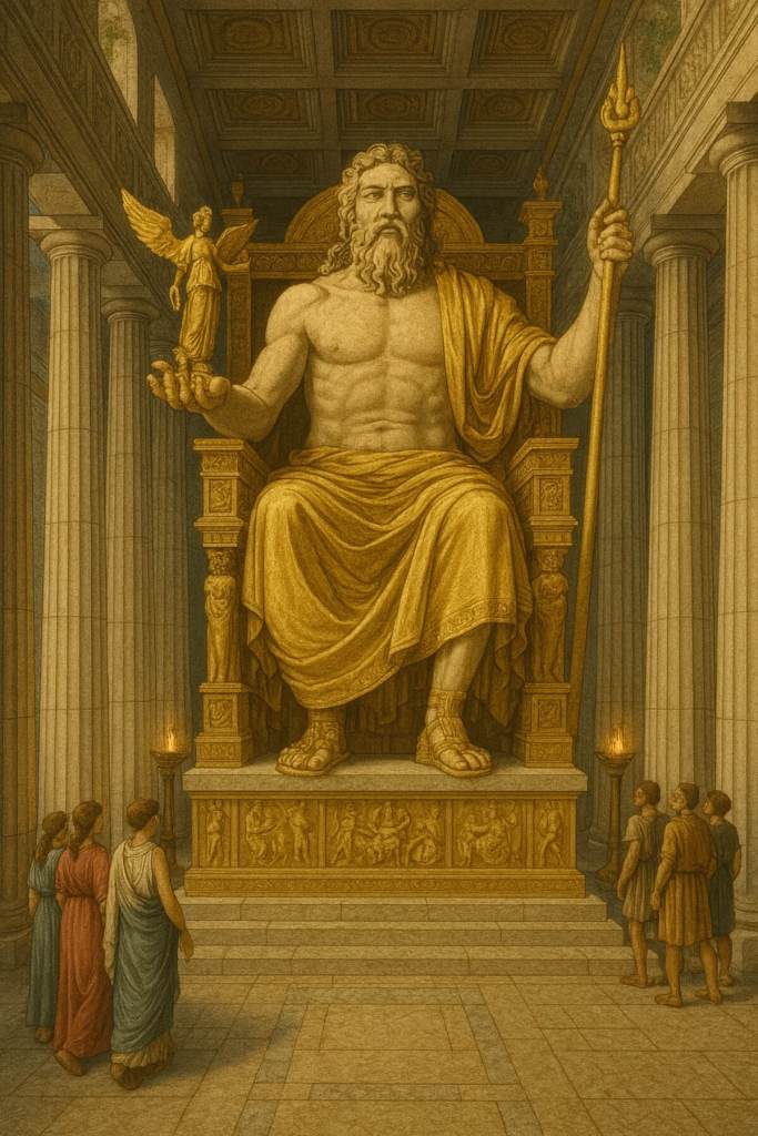La estatua de Zeus, una de las más célebres esculturas de la Antigüedad, se alzaba imponente en el interior del templo dedicado al dios en Olimpia. Realizada hacia el año 435 a.C. por el escultor Fidias, la figura alcanzaba una altura aproximada de 12 metros y estaba hecha con una técnica mixta de oro y marfil conocida como crisoelefantina. Zeus aparecía sentado en un trono ricamente decorado, con un cetro en una mano —rematado por un águila— y una figura de la diosa Niké en la otra, símbolo de la victoria. Su sola presencia llenaba por completo el espacio interior del templo, hasta el punto de que, según se decía, si Zeus se levantaba, rompería el techo.
