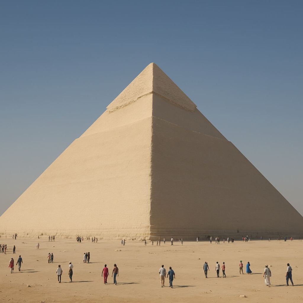 La imagen recrea la Gran Pirámide de Giza tal como habría lucido poco después de su construcción, hace más de 4.500 años. En su forma original, esta maravilla del mundo antiguo no tenía el aspecto erosionado y rugoso que hoy vemos. Estaba completamente revestida de piedra caliza blanca pulida, que reflejaba la luz solar de forma deslumbrante. Algunos textos antiguos la describen como un faro de luz que podía verse desde kilómetros de distancia. La reconstrucción incluye este revestimiento perdido, devolviéndole su geometría impecable y su acabado casi brillante.
