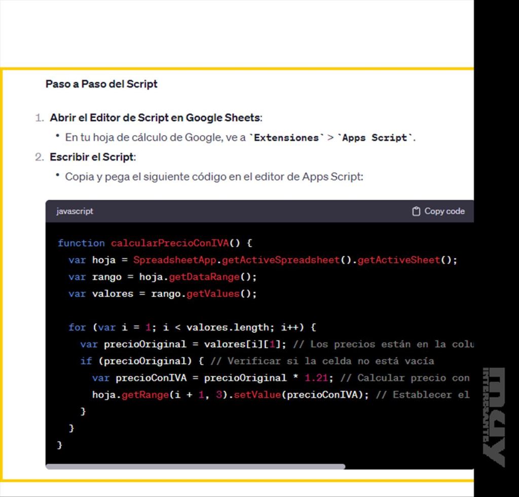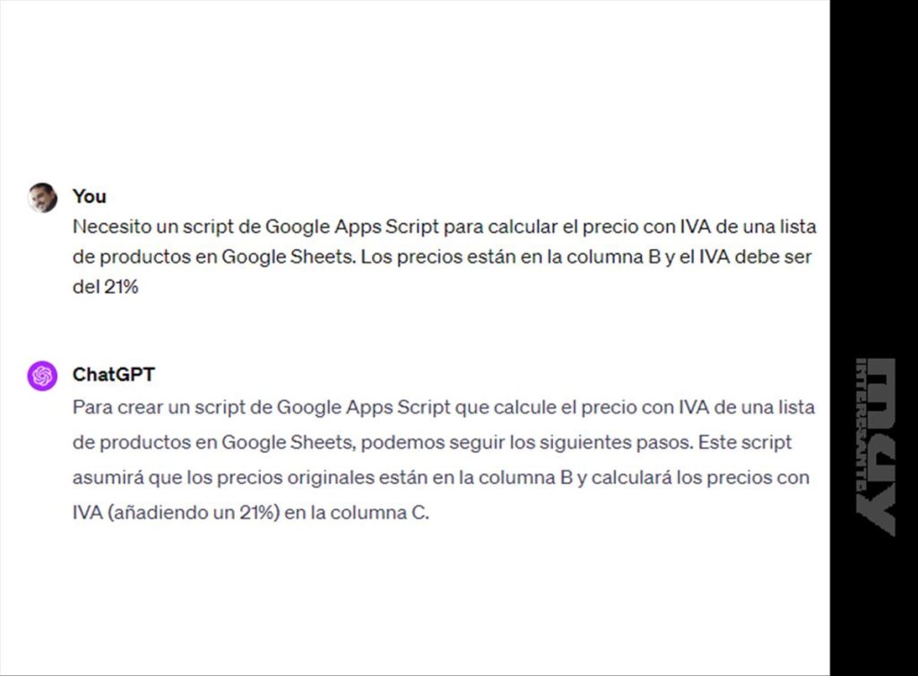 Ve a ChatGPT y describe tu necesidad. Por ejemplo, puedes decir: "Necesito un script de Google Apps Script para calcular el precio con IVA de una lista de productos en Google Sheets. Los precios están en la columna B y el IVA debe ser del 21%".