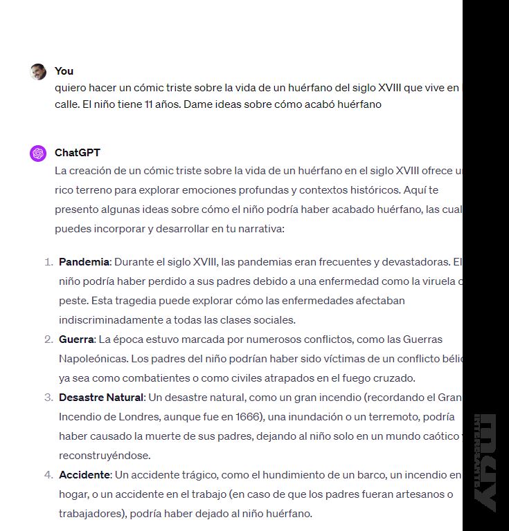 - Sugerencia de tramas y subtramas: El creador puede pedir a ChatGPT que proponga ideas para tramas o subtramas basadas en los elementos ya definidos del cómic.