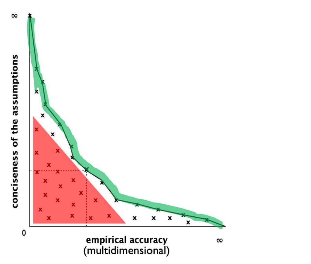 Gráfico con ejes de precisión empírica y concisión epistémica, donde se muestra qué modelos son descartables (rojo) y cuáles son de estado del arte (verde). Fuente: arXiv