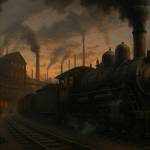 Ciudad industrial del siglo XIX al anochecer, con una locomotora de vapor avanzando entre fábricas humeantes y trabajadores junto a los raíles, simbolizando el poder, el cambio y el impacto humano de la Revolución Industrial.