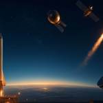 Imagen panorámica hiperrealista que muestra un cohete en una plataforma de lanzamiento al atardecer, con el cielo oscuro lleno de estrellas y un satélite orbitando sobre el horizonte. En primer plano, una gran antena parabólica apunta al espacio, simbolizando la conexión entre la Tierra y la exploración interplanetaria.