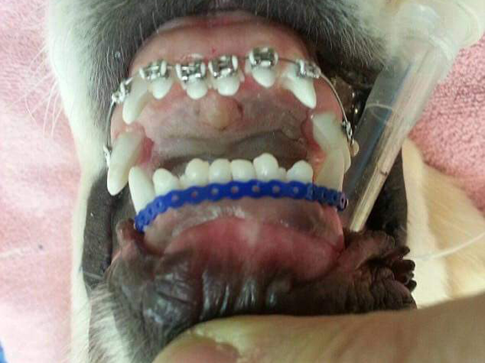 El veterinario Jim Moore ha sido el primero en introducir este novedoso método de ayuda a la salud dental perruna. Según sea el problema del perro, la ortodoncia puede ser de silicona, metal o incluso, dependiendo del grado de deformidad, se opta por otros tratamientos de corrección bucal. Él fue el encargado de colocar la ortodoncia al perro que podemos ver en las imágenes (Vía: Twitter @donvergalargajr).