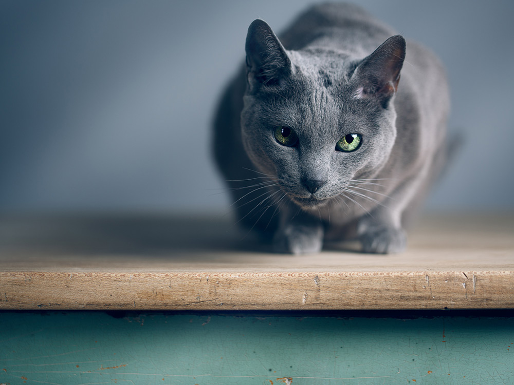 El gato azul ruso enamora con solo mirarlo. Se hace imposible no posar la vista en sus potentes ojos de color esmeralda que contrastan con un pelaje gris y tupido que le da aspecto de peluche. Tampoco pasan desapercibidos sus andares elegantes y casi aristocráticos y su cuerpo esbelto y fibroso, listo para la caza.