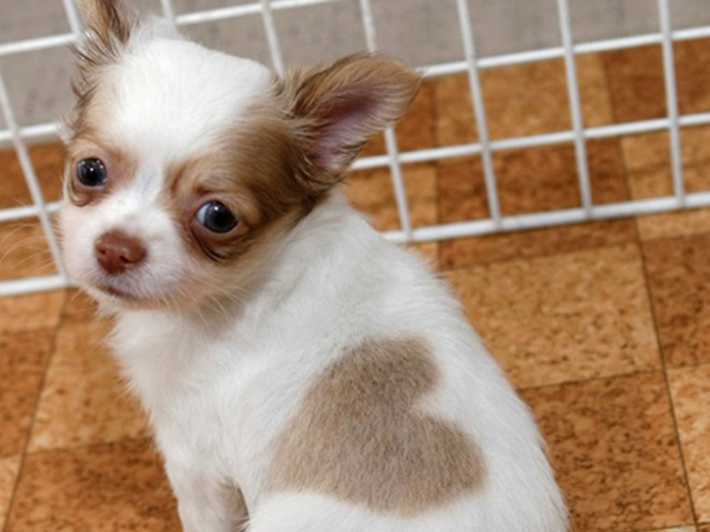 La máscara de héroe de Batman está impresa en el pecho de este cachorro. Foto: sentacs.de.