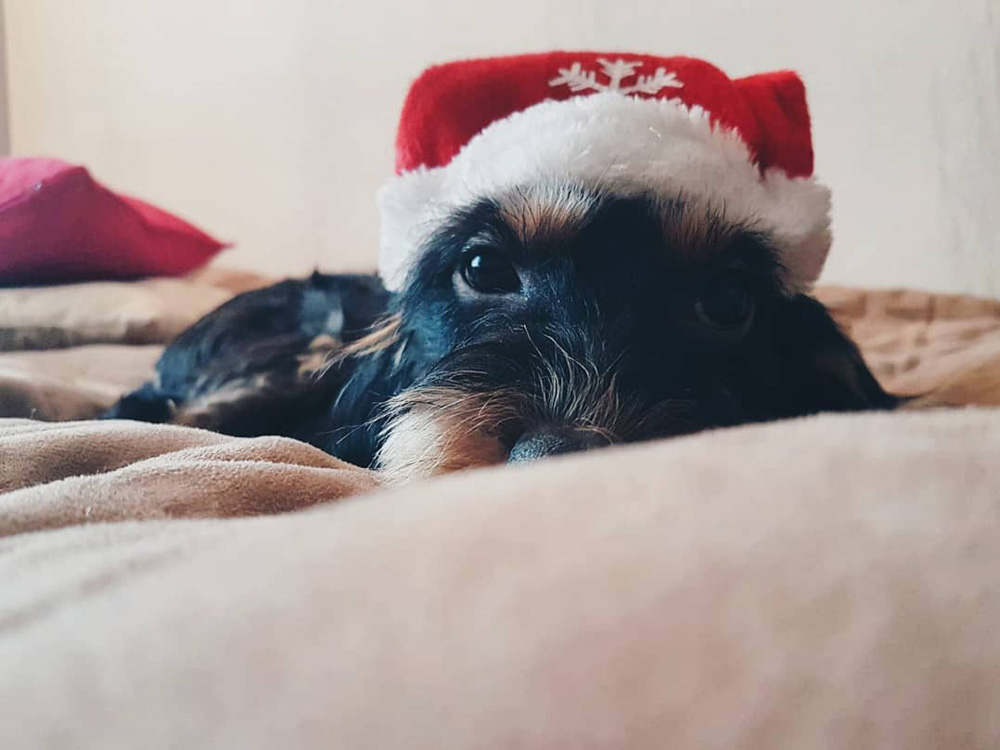 Esta pequeña es una mezcla de teckel que está muy a gusto en su casa en Navidad. Foto: IG @ellidogg.