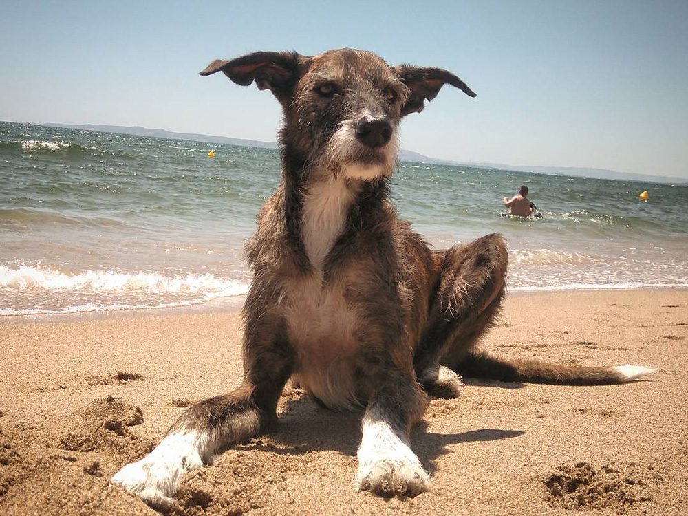 Argos es un mestizo de galgo que vive en Sevilla y está muy mimado... ¡Miradlo en la playa! Por todas partes cada vez se adopta más, y por eso empiezan a predominar los mestizos como él, y nos alegramos. Foto: IG @iasg1602.