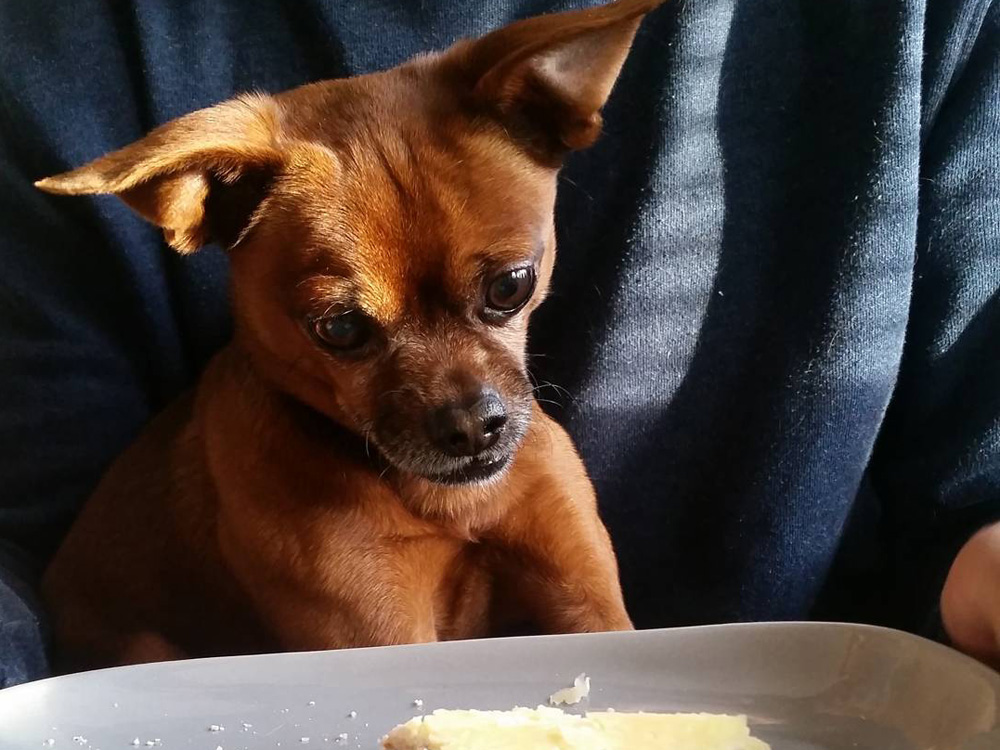 ¡Mirad cómo este pequeño no quita ojo al plato! Foto: IG @im_miothedog.