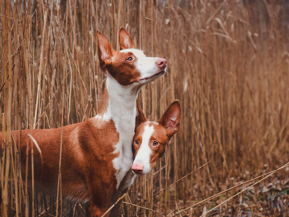 Otro de los rasgos que más le diferencia del resto de podencos es el color rojo de su pelaje. No obstante, presentan varias variantes: su pelaje puede ser blanco unicolor, rojo (o cobrizo) casi unicolor, o, lo más común, a partes iguales, como los dos perros de la foto.