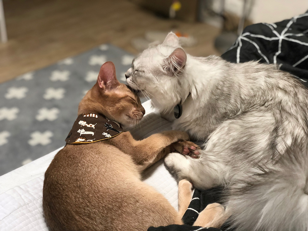 Estos dos gatos están ya medio dormidos, y el beso de buenas noches no puede faltar. Foto: IG @cat_ezmaro.