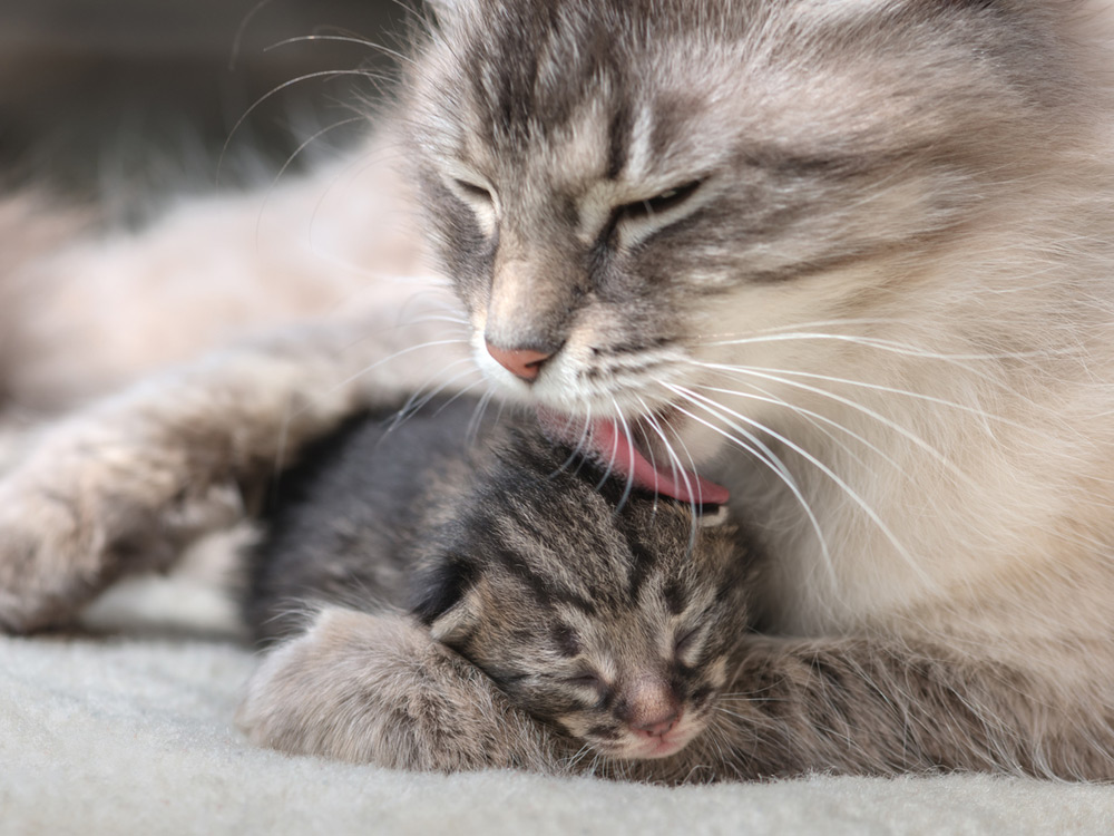 Los lametones que mamá gata da a sus gatitos son importantes para el desarrollo físico de los pequeños, para estimular su respiración, defecación y orina.
