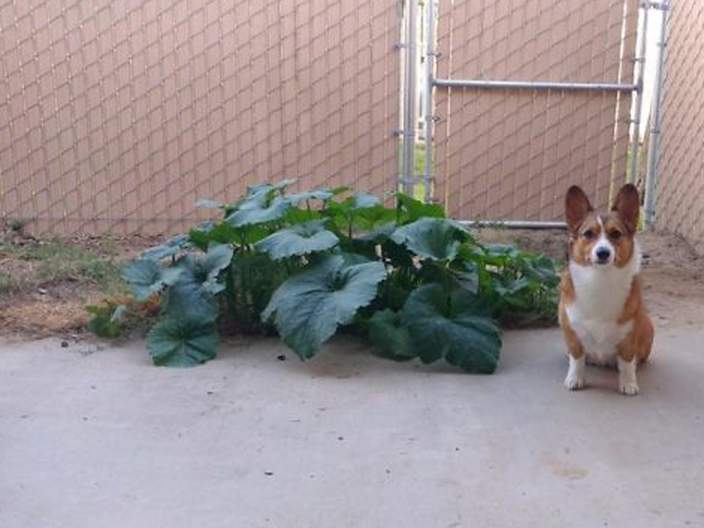 El corgi de la foto se comió unas semillas de calabaza, más tarde las defecó y, con el tiempo, ha crecido esta planta.